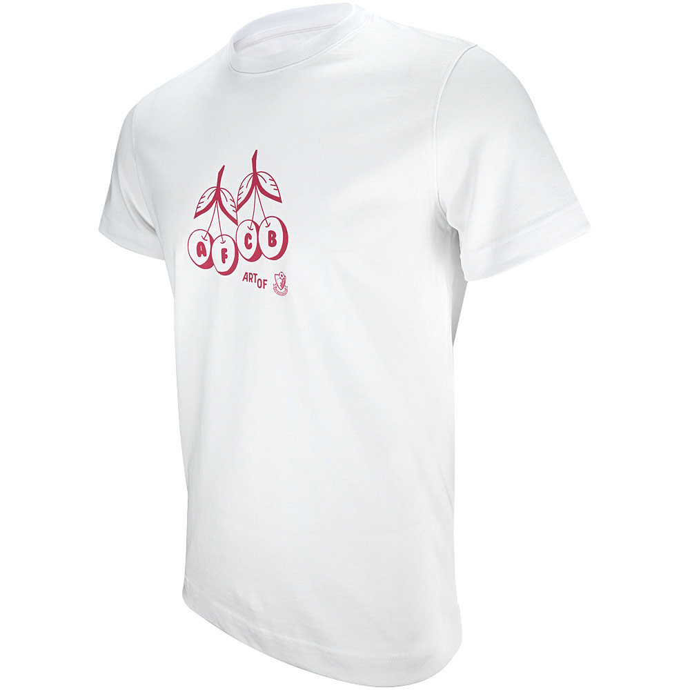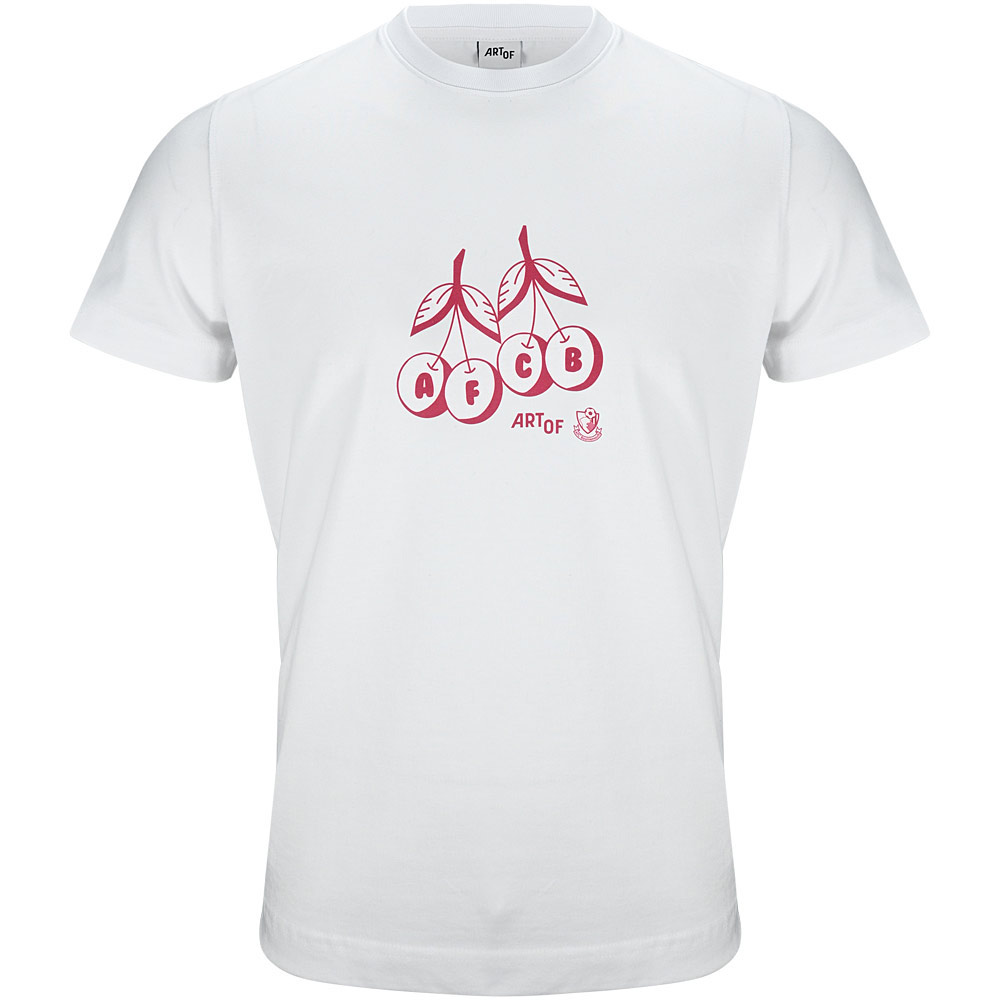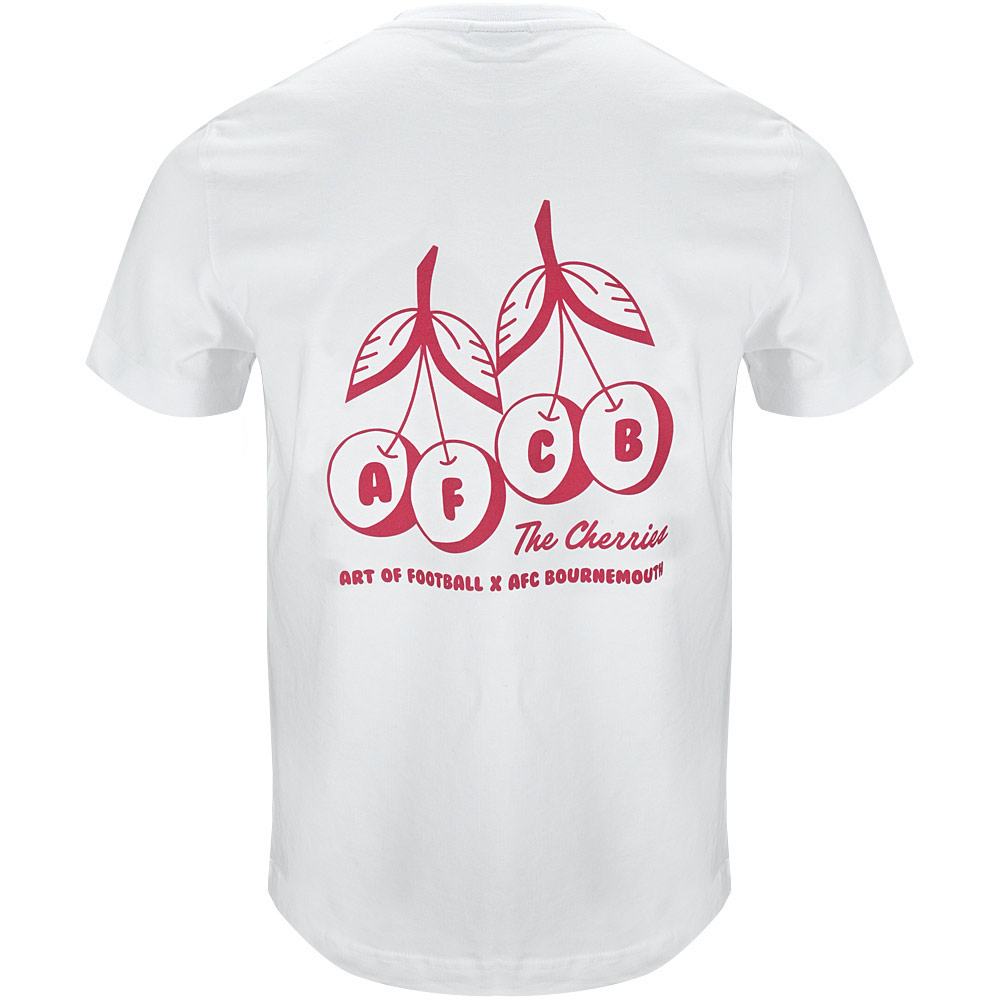 This white Art Of X AFCB Retro Cherries Tee brings a clean, nostalgic look with its classic round neck, short sleeves and easy regular fit. The front showcases a retro‑inspired cherries motif paired with AFCB initialling and a subtle Art Of logo, while the back features an expanded Art Of Football x AFC Bournemouth design with a bold Cherries graphic for added character. Suitable for both men and women, it offers a fresh, versatile style that celebrates the club’s heritage in a standout way.