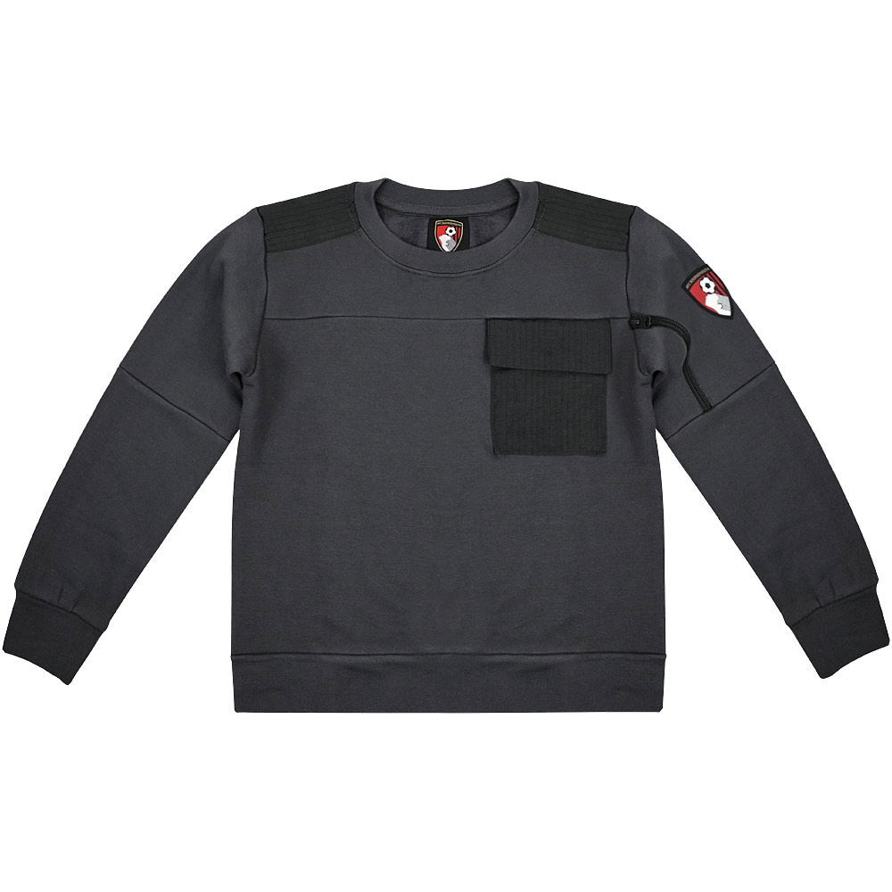 Perfect for young Cherries fans, this charcoal grey AFC Bournemouth kid's Arena sweatshirt combines comfort with a smart, sporty style. Crafted from a soft cotton blend with a cosy fleece lining, the regular fit sweatshirt is designed to keep kids warm while looking sharp. It features a ripstop nylon breast pocket, a rubber crest pouch with a handy zip pocket on the left arm, and contrasting black shoulder panel trims for a modern finish. A practical and stylish choice, it’s ideal for everyday wear or cheering on the Cherries on match day.