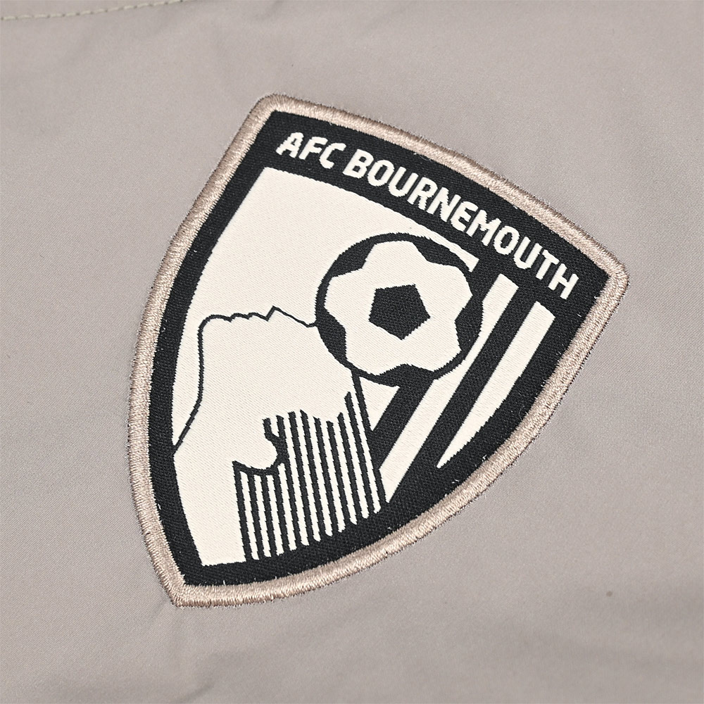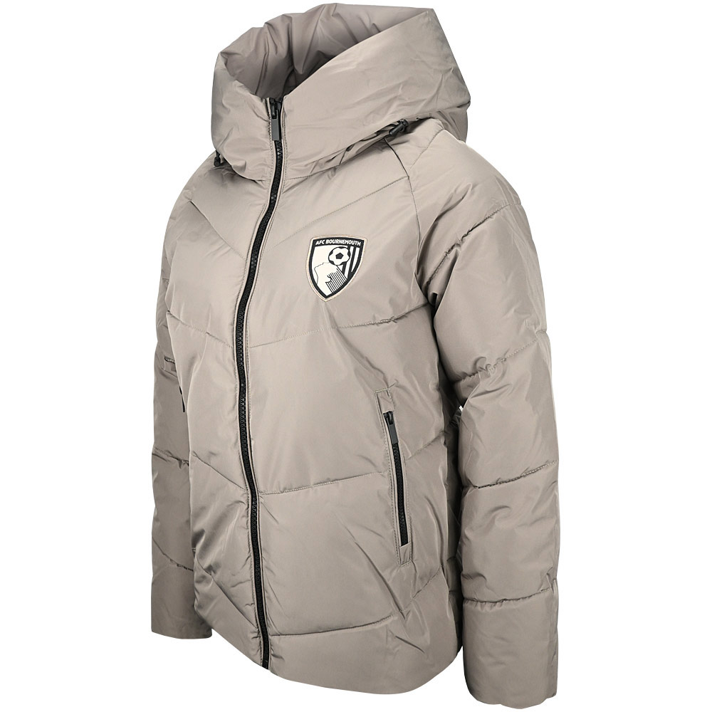 Keep cosy and stylish in the AFC Bournemouth Women’s Aspen Jacket in mushroom. This regular-fit puffer-style coat is crafted from a soft peached nylon outer with polyester padding and lining for lasting warmth and comfort. The design features an oversized hood for added coverage, a contrasting full-length zip, and two zipped hand pockets for practicality. Finished with chic chevron quilt stitching, this jacket offers a flattering shape and modern look. The tonal woven club crest adds a subtle finishing touch, making it an ideal choice for staying warm while showing your support in understated style.