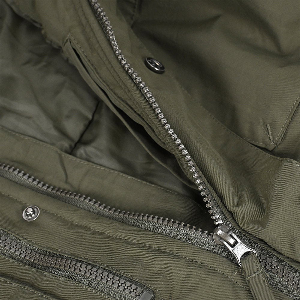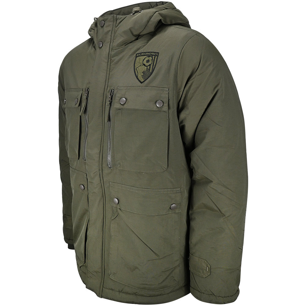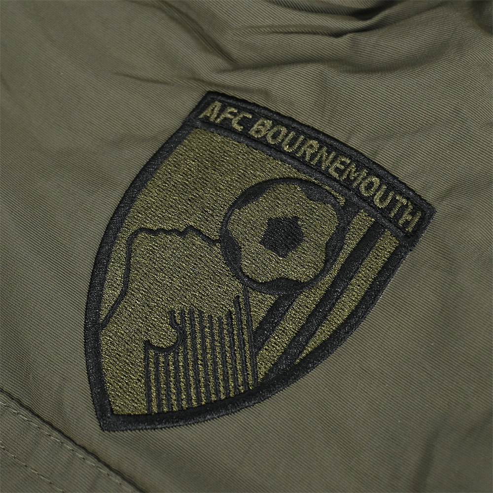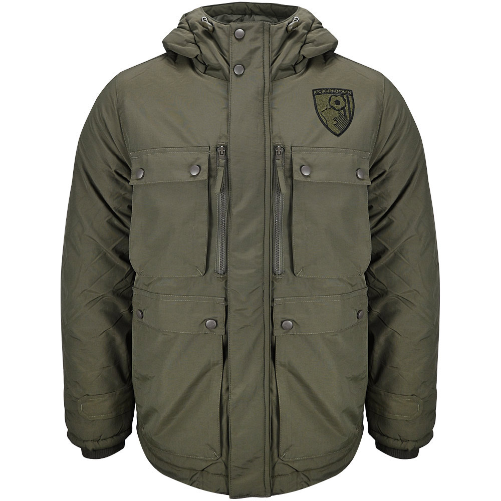 Stay warm and comfortable through the colder months with the AFC Bournemouth adult's Columbus coat in khaki. Designed for everyday wear, this regular-fit long jacket combines practicality and style with its durable nylon outer and soft polyester padding and lining. The coat features a chunky full-length zip with a popper-down storm flap to keep out the chill, along with ribbed cuffs for a snug finish. Multiple storage options include four front cargo-style pockets, two zipped breast pockets, and an inside pocket for essentials. The warm padded hood with an adjustable fit adds extra protection against the elements, while the tonal woven club crest offers a subtle nod to your support for the Cherries.