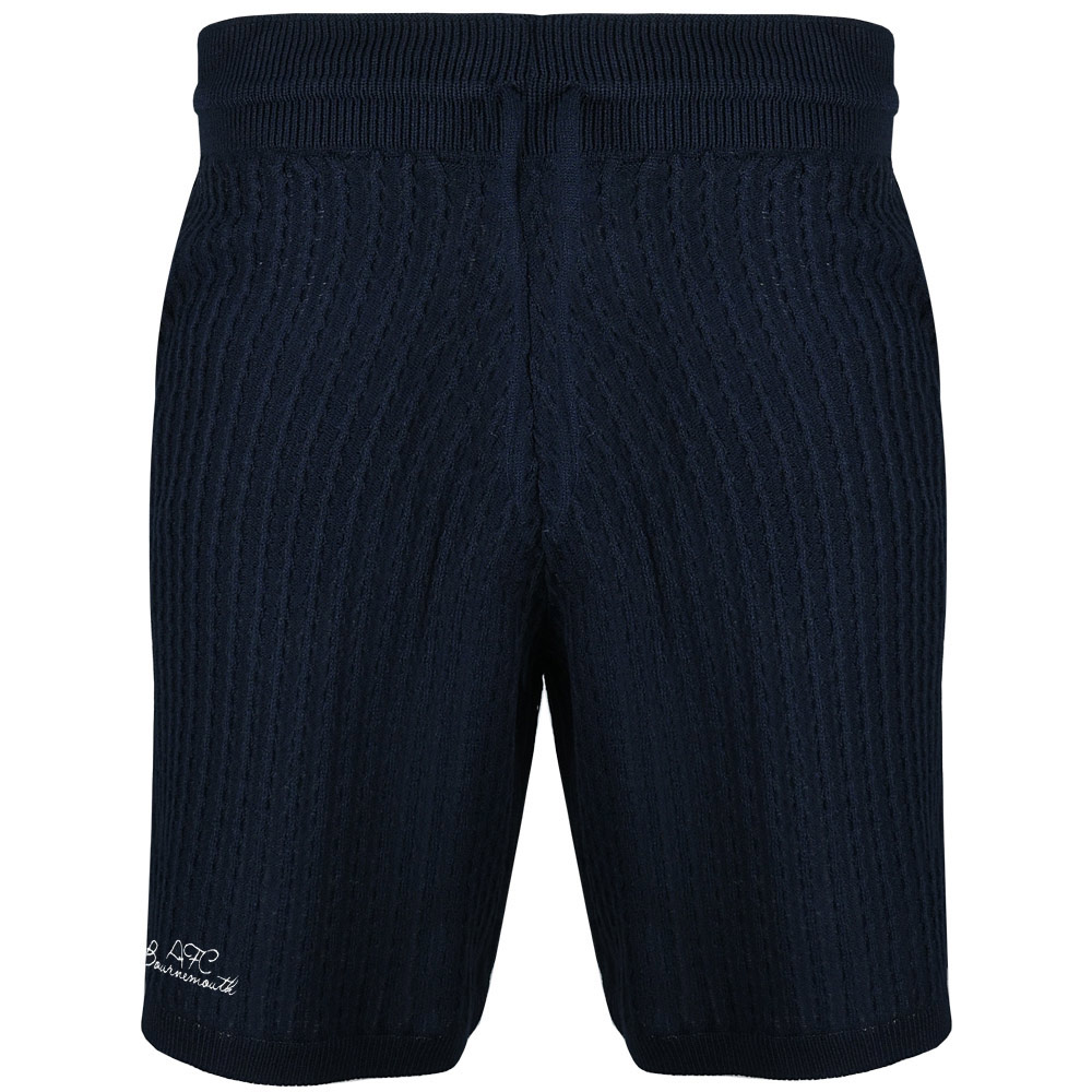 Complete your look with the AFC Bournemouth Adults Elite Shorts in navy, designed to offer a smart yet relaxed feel for warmer days. Crafted from fine knit acrylic, these regular fit shorts feature a subtle cable knit design that adds texture and a refined finish. The wide waistband with drawstring fastening ensures a comfortable, adjustable fit, making them ideal for everyday wear. Finished with AFC Bournemouth scripted embroidery on the right leg, these smart shorts are perfect as casual summer shorts while still delivering a polished, coordinated style.