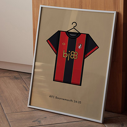 This Minimal Kits bespoke AFC Bournemouth A3 poster card features our 125th anniversary home kit. Perfect for any supporters home, and printed on high quality card, the print is ready for adding to the frame of your choice, or can be wall mounted.