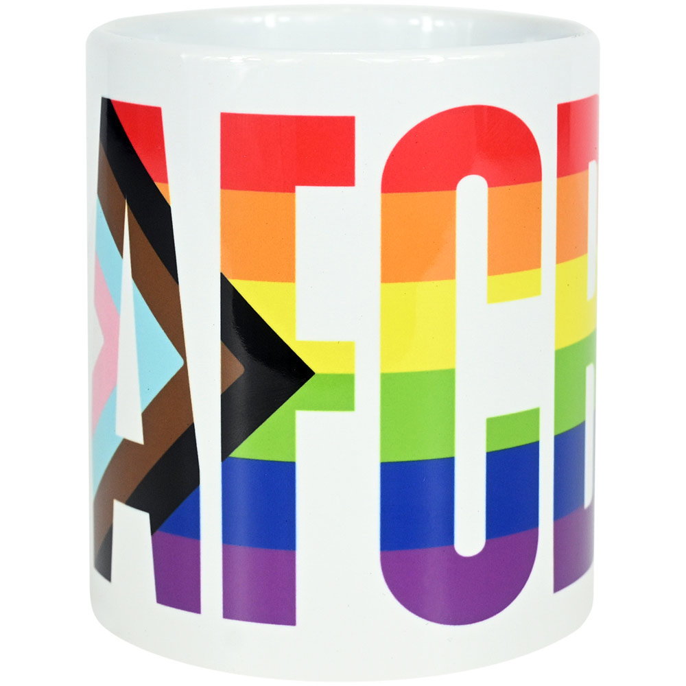 Celebrate your love for AFC Bournemouth and support the LGBTQ+ community with this beautifully crafted ceramic mug. Featuring a vibrant rainbow flag design encircling the AFCB initials, along with the heartfelt message "Proud To Be AFCB" and a small club crest, this mug makes a perfect addition to any Cherries fan's collection. The crisp white finish highlights the bold colours, symbolising inclusivity and support for the LGBT community. Show your unwavering loyalty to both your club and the values of equality with this unique and meaningful mug.