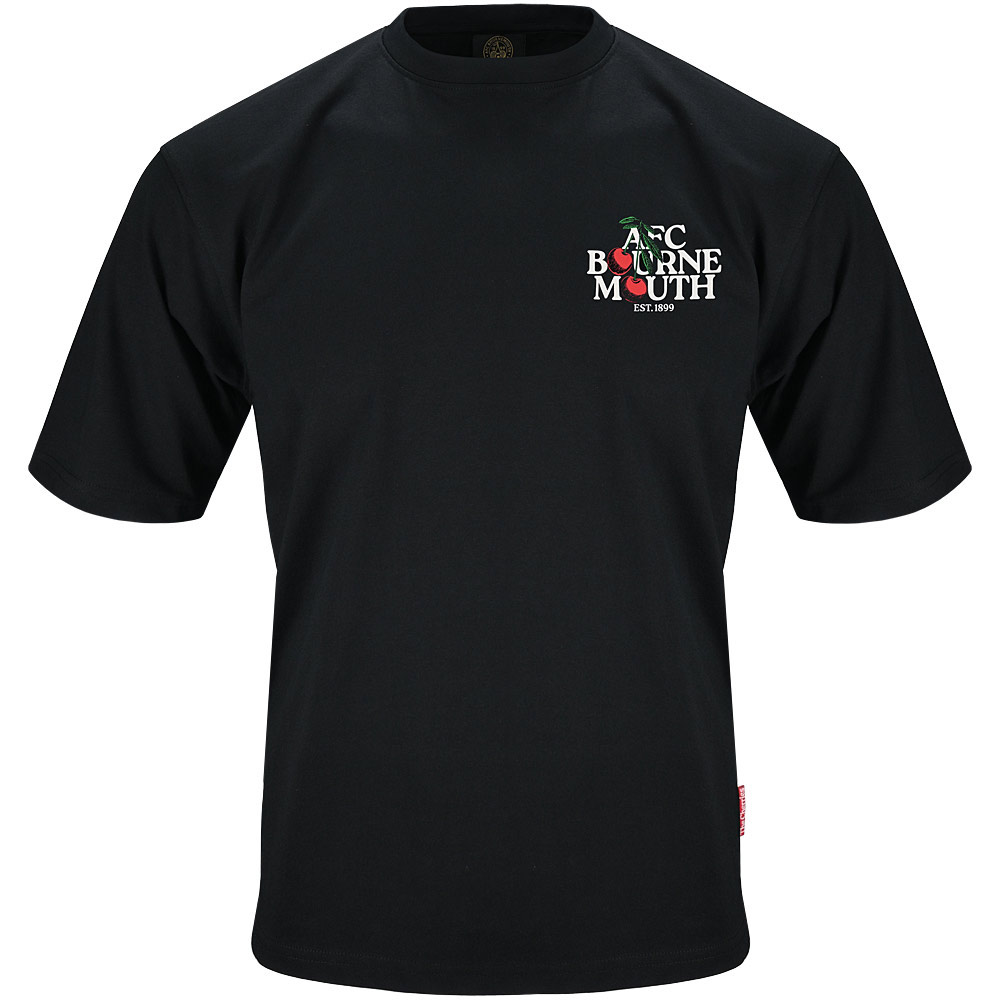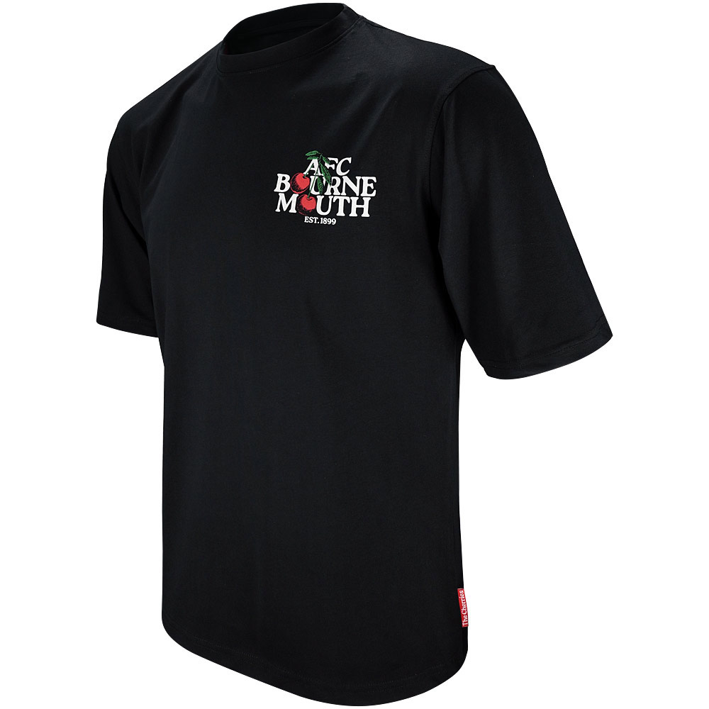 Elevate your casual look with the AFC Bournemouth Premium Cherries Oversized Tee, a standout piece from the exclusive Premium Cherries collection. Crafted from heavyweight cotton, this black oversized t-shirt offers both comfort and durability, perfect for everyday wear or showing off your support in style. The bold design features a large "AFC Bournemouth" print across the back, seamlessly integrated with a distinctive cherry graphic, while a smaller logo print sits on the chest for a subtle yet impactful touch.