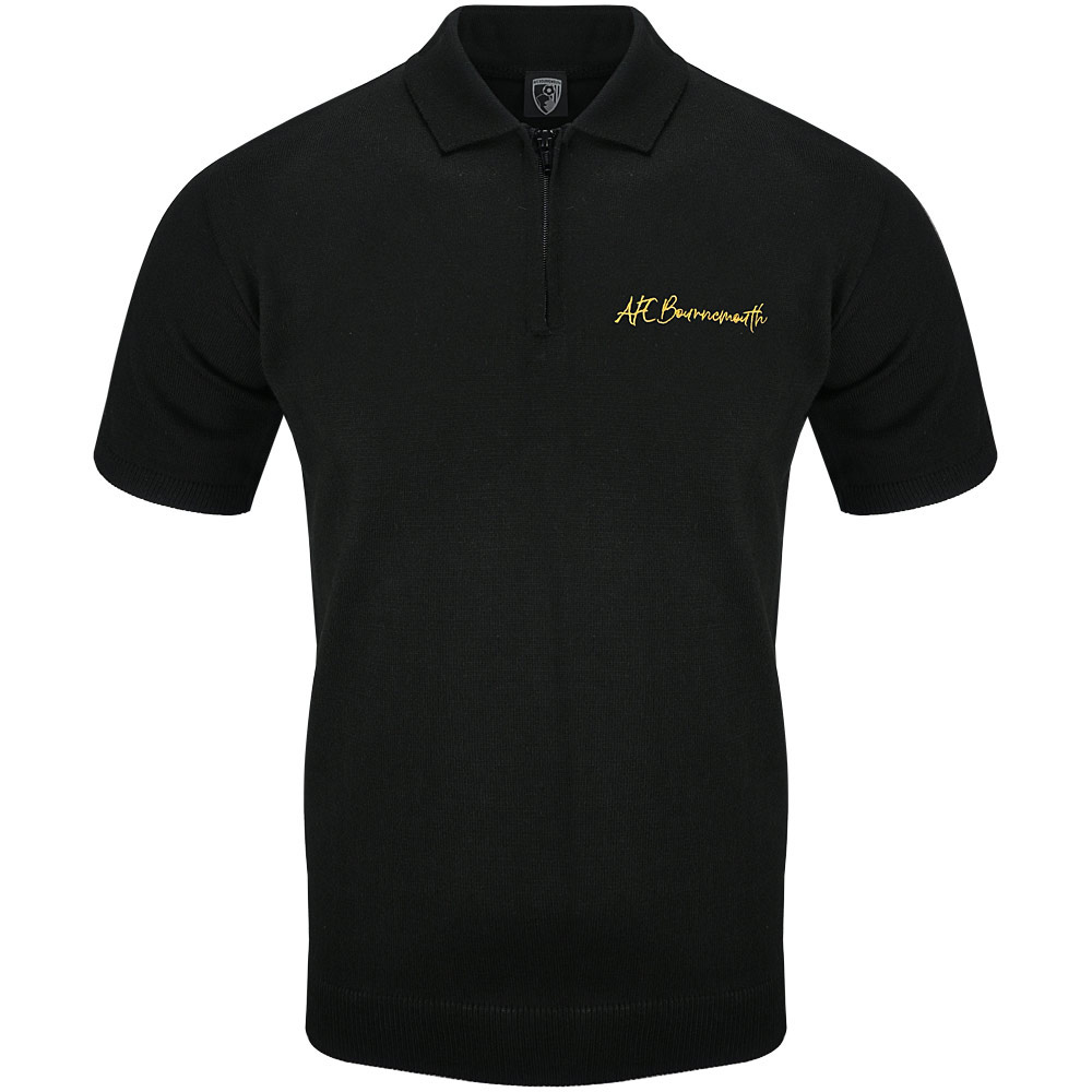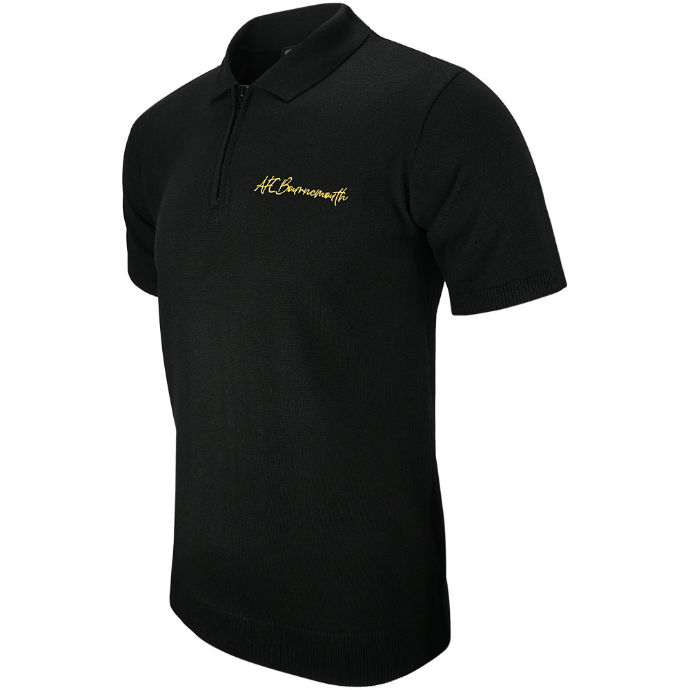 Elevate your everyday look with the AFC Bournemouth Adults Signature Polo Shirt in classic black. Crafted from fine knit fabric for a soft, comfortable feel, this smart men’s polo shirt combines a premium look with effortless versatility. Designed in a regular fit, it features short sleeves, a stylish tipped collar and a sleek zip neck for a modern finish. The standout detail is the elegant gold scripted AFC Bournemouth embroidery on the chest, adding a refined touch that subtly shows your support.