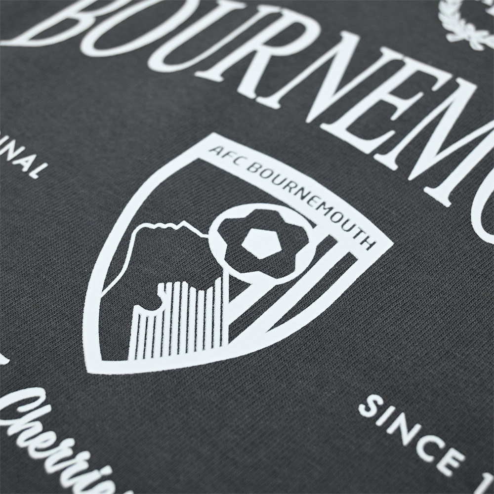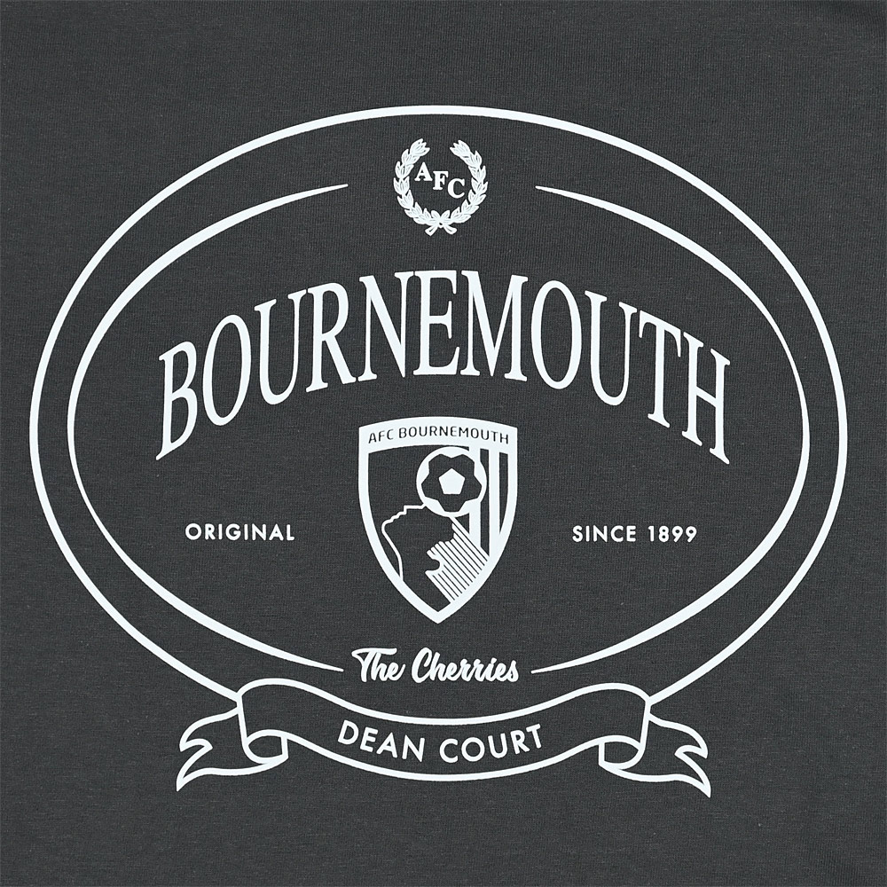 This AFC Bournemouth adults’ Torrens T‑shirt brings a vintage-inspired look to a versatile charcoal colourway, offering a comfortable regular fit in soft cotton. Designed with a classic round neck and short sleeves, it’s suitable for all supporters who enjoy a more traditional style. The large front print features an oval graphic with a laurel wreath detail and the club crest, giving the T‑shirt a heritage feel while showing support for the team.