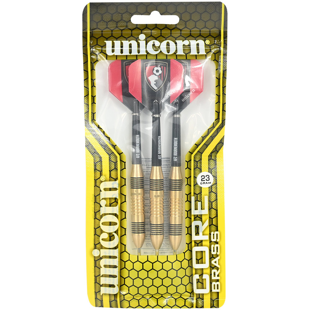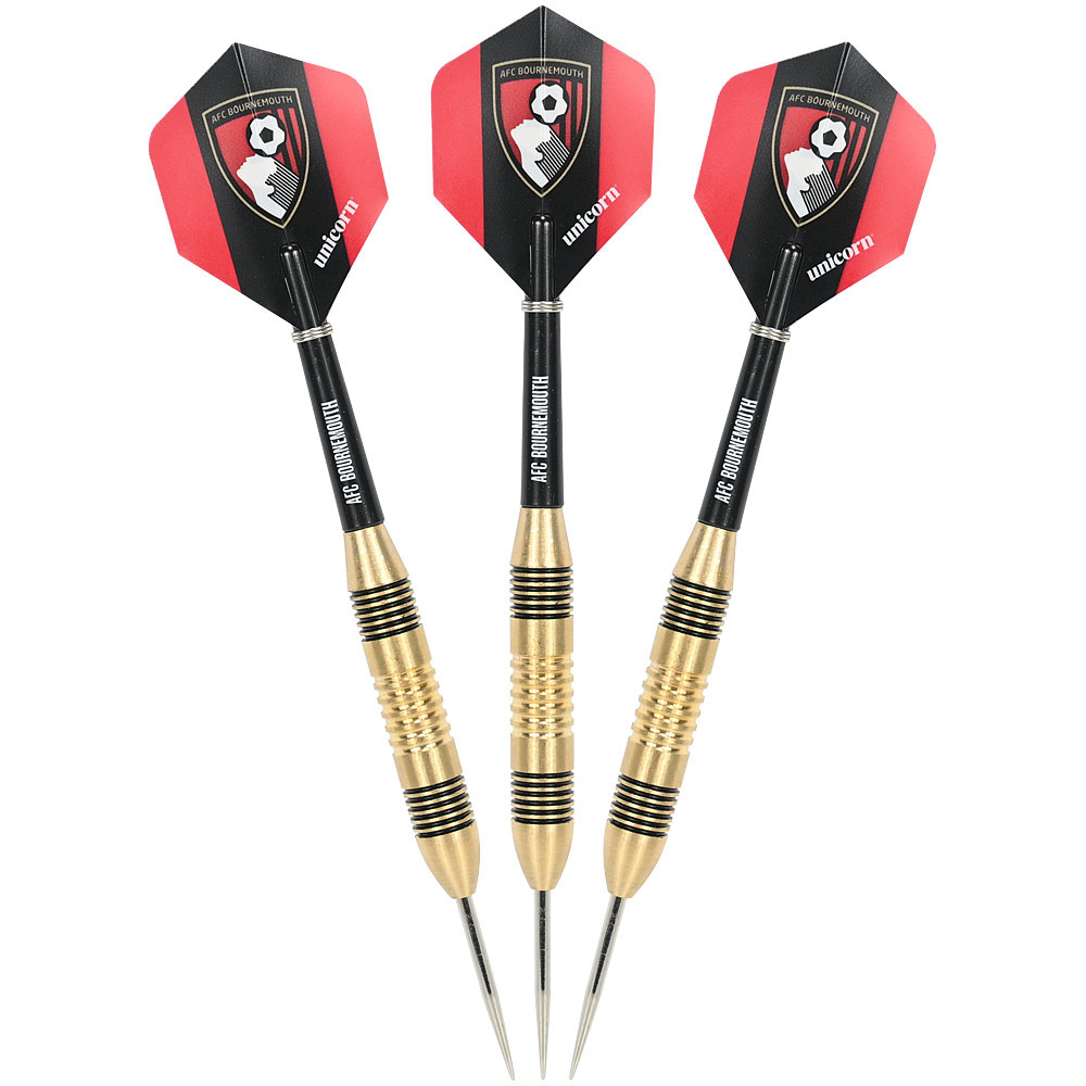 Take your game to the next level with the AFC Bournemouth x Unicorn Core Brass Darts – a unique collaboration between the Cherries and the legendary darts brand, Unicorn. Expertly crafted brass barrels with steel tips offer balance and control, making them ideal for social players and home use. Each 23g dart features striking red and black flights adorned with alternating AFC Bournemouth crests and Unicorn branding, combining performance with support for the Cherries.