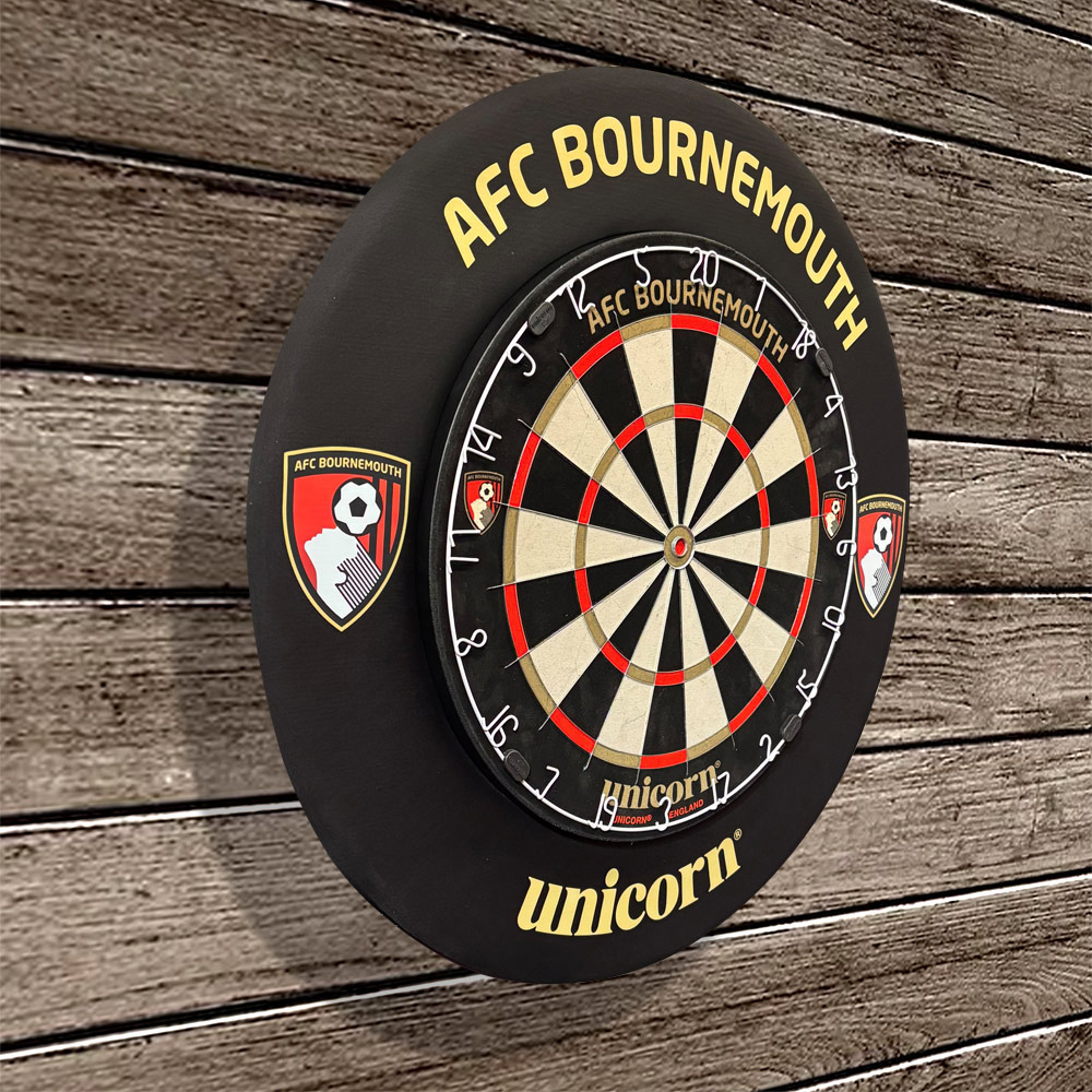 Show your Cherries pride with the AFC Bournemouth x Unicorn Striker Dartboard Surround – a unique collaboration with the legendary darts brand, Unicorn. Crafted from durable yet lightweight EVA, this protective surround fits perfectly over all standard-size dartboards, shielding your walls from stray darts while adding a touch of club spirit. Finished in sleek black with full-colour AFC Bournemouth crests, the iconic Unicorn logo, and striking gold *AFC BOURNEMOUTH* lettering, it’s the perfect addition to any fan’s games room.