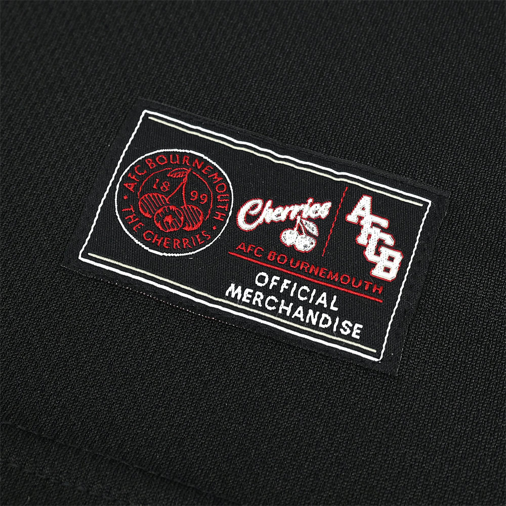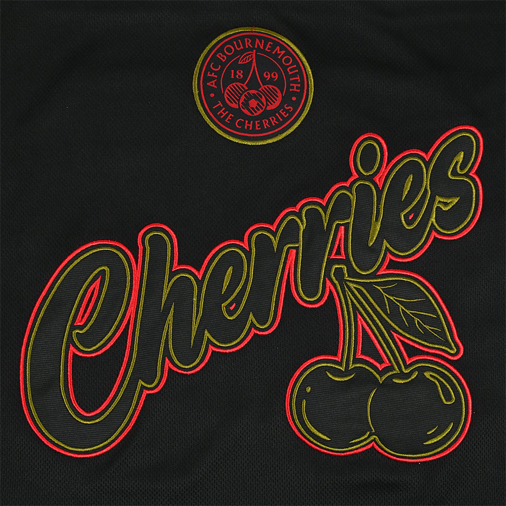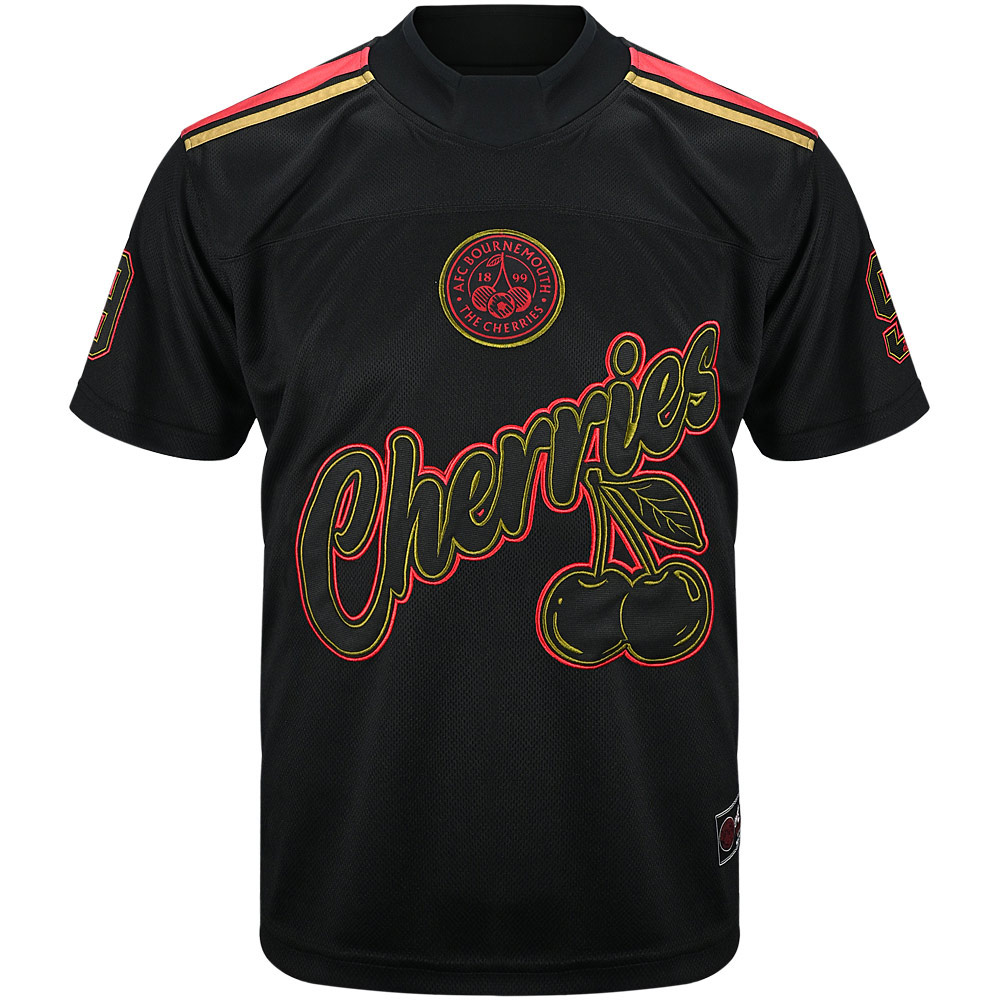 Show your colours with this AFC Bournemouth American Football jersey, a striking shirt with stand out style. Made from soft mesh fabric with a boxy fit, the black jersey is elevated by striking red and gold trim on the shoulders, a large embroidered Cherries applique across the chest, and a detailed Cherries crest roundel applique. The number “99” proudly references the club’s 1899 formation year - featuring on the back and sleeves, while subtle AFCB initialling on the rear neck adds a premium touch. Combining gridiron-inspired styling with unmistakable Cherries identity, this shirt is perfect for matchdays, casual wear, or adding something different to your collection.