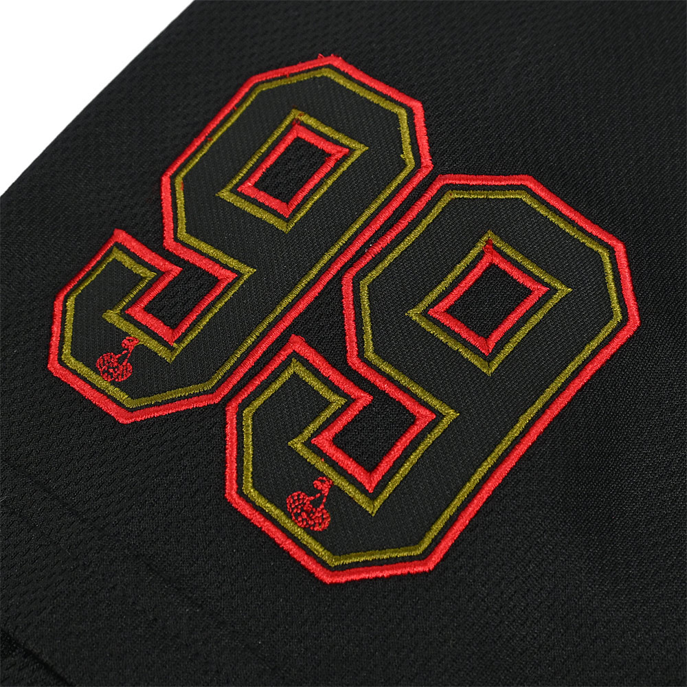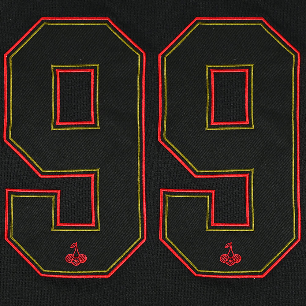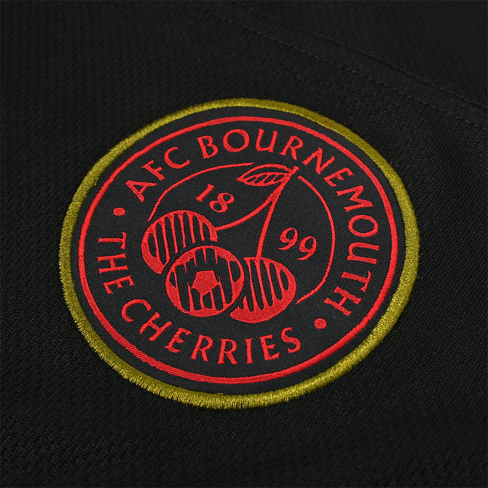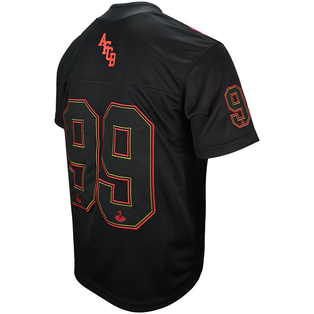 Show your colours with this AFC Bournemouth American Football jersey, a striking shirt with stand out style. Made from soft mesh fabric with a boxy fit, the black jersey is elevated by striking red and gold trim on the shoulders, a large embroidered Cherries applique across the chest, and a detailed Cherries crest roundel applique. The number “99” proudly references the club’s 1899 formation year - featuring on the back and sleeves, while subtle AFCB initialling on the rear neck adds a premium touch. Combining gridiron-inspired styling with unmistakable Cherries identity, this shirt is perfect for matchdays, casual wear, or adding something different to your collection.