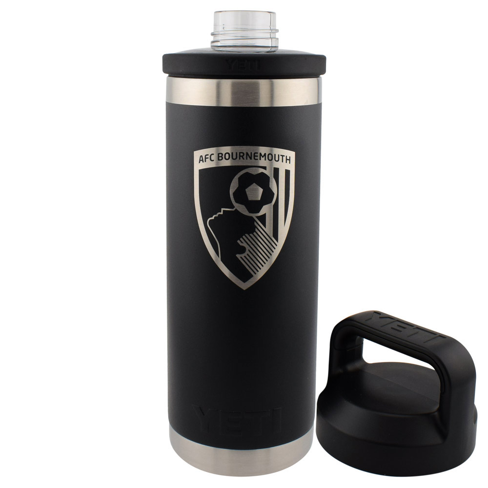 AFC Bournemouth have teamed up with renowned brand Yeti to produce this great range of YETI x AFCB drinkware. This black 18 oz chug bottle is perfect for hot and cold drinks on the go, with a rugged powder coated steel outer and double wall vacuum lining to maintain the temperature of your drink whether hot or cold. The bottle has a durable screw down spout with wide opening and a screw down easy-carry handle. Finished with a laser etched AFC Bournemouth crest on the front alongside Yeti's logo.