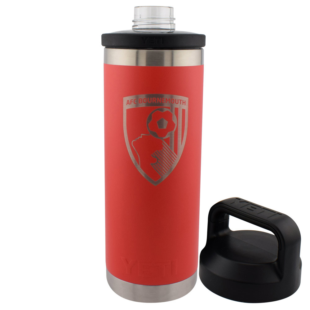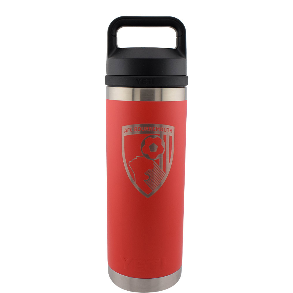 AFC Bournemouth have teamed up with renowned brand Yeti to produce this great range of YETI x AFCB drinkware. This red 18 oz chug bottle is perfect for hot and cold drinks on the go, with a rugged powder coated steel outer and double wall vacuum lining to maintain the temperature of your drink whether hot or cold. The bottle has a durable screw down spout with wide opening and a screw down easy-carry handle. Finished with a laser etched AFC Bournemouth crest on the front alongside Yeti's logo.