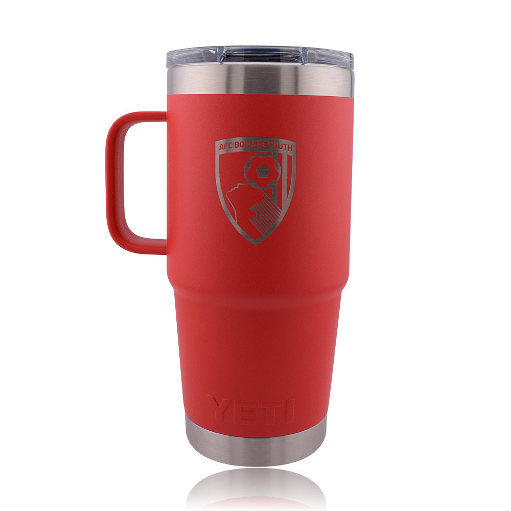 AFC Bournemouth have teamed up with renowned brand Yeti to produce this great range of YETI x AFCB drinkware. This red 20 oz travel mug has a large capacity, and is perfect for hot and cold drinks on the go, with a rugged powder coated steel outer and double wall vacuum lining to maintain the temperature of your drink whether hot or cold. The travel mug has a durable leak proof screw down lid with magnetic slider, and is designed to fit most cup holders. Finished with a comfortable carry handle, and a laser etched AFC Bournemouth crest on the front alongside Yeti's logo.