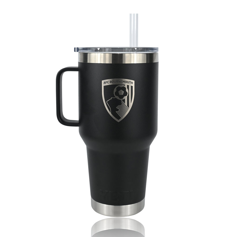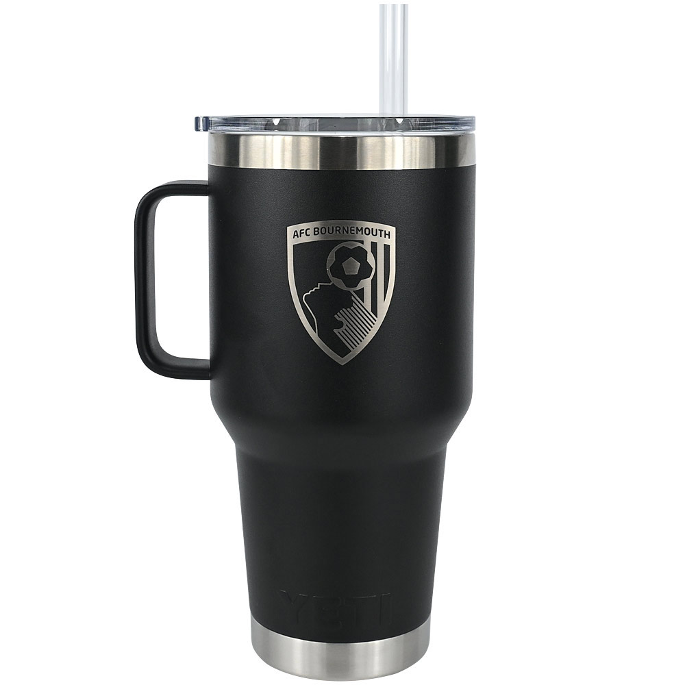 AFC Bournemouth have teamed up with renowned brand Yeti to produce this great range of YETI x AFCB drinkware. Built from durable, powder-coated 18/8 stainless steel, this premium 35oz black drinks mug is rust and puncture resistant, ensuring it stands up to everyday use. The double-wall vacuum insulation keeps your cold drinks chilled for longer, while the splash-resistant push-down lid and BPA-free straw make sipping effortless. With a generous 1.2L capacity and a cupholder-compatible design, it’s perfect for travel, training, or time on the terraces. Dishwasher safe for easy cleaning, and compatible with the MagSlide lid (which can be purchased from Yetis) for hot drinks, this versatile YETI bottle combines lasting quality with AFC Bournemouth style.